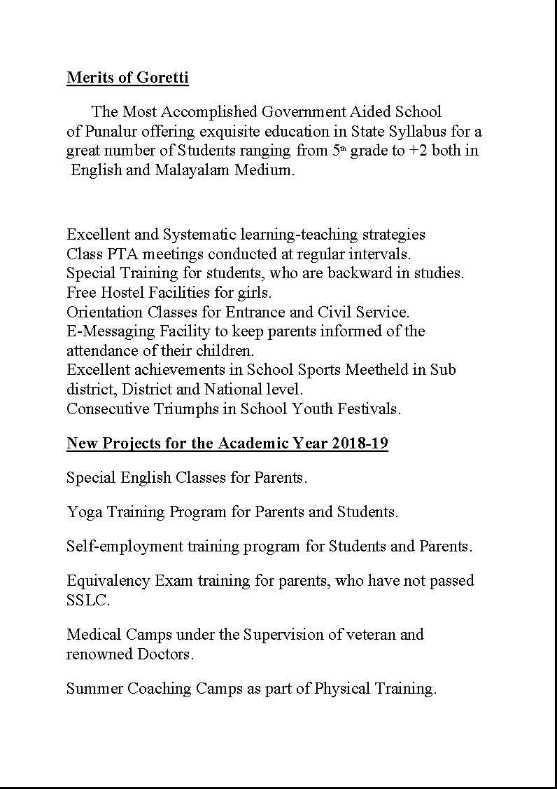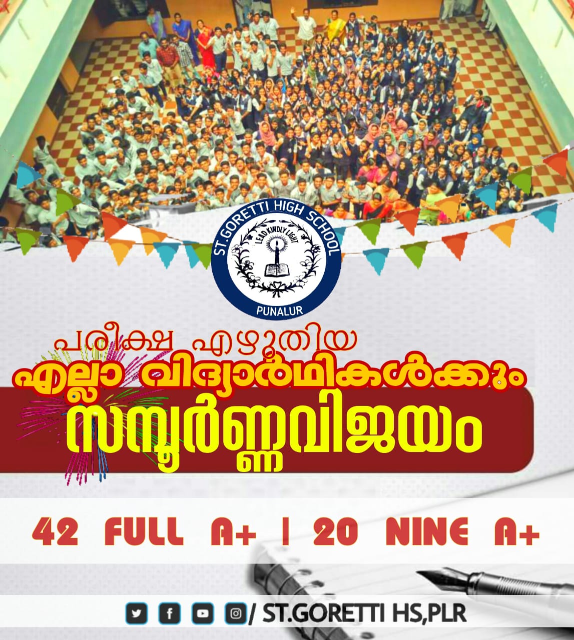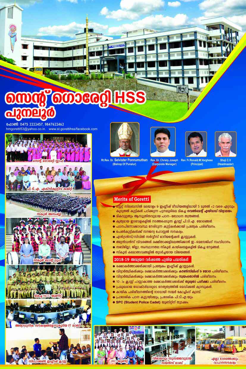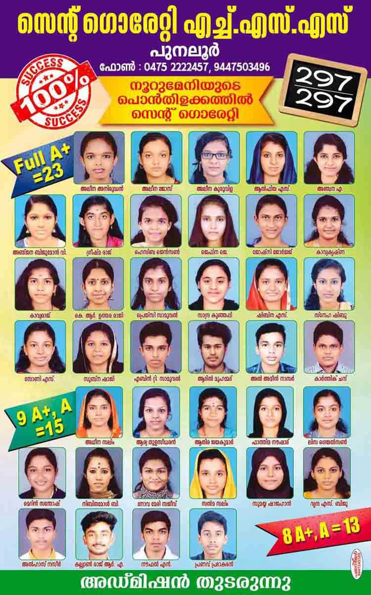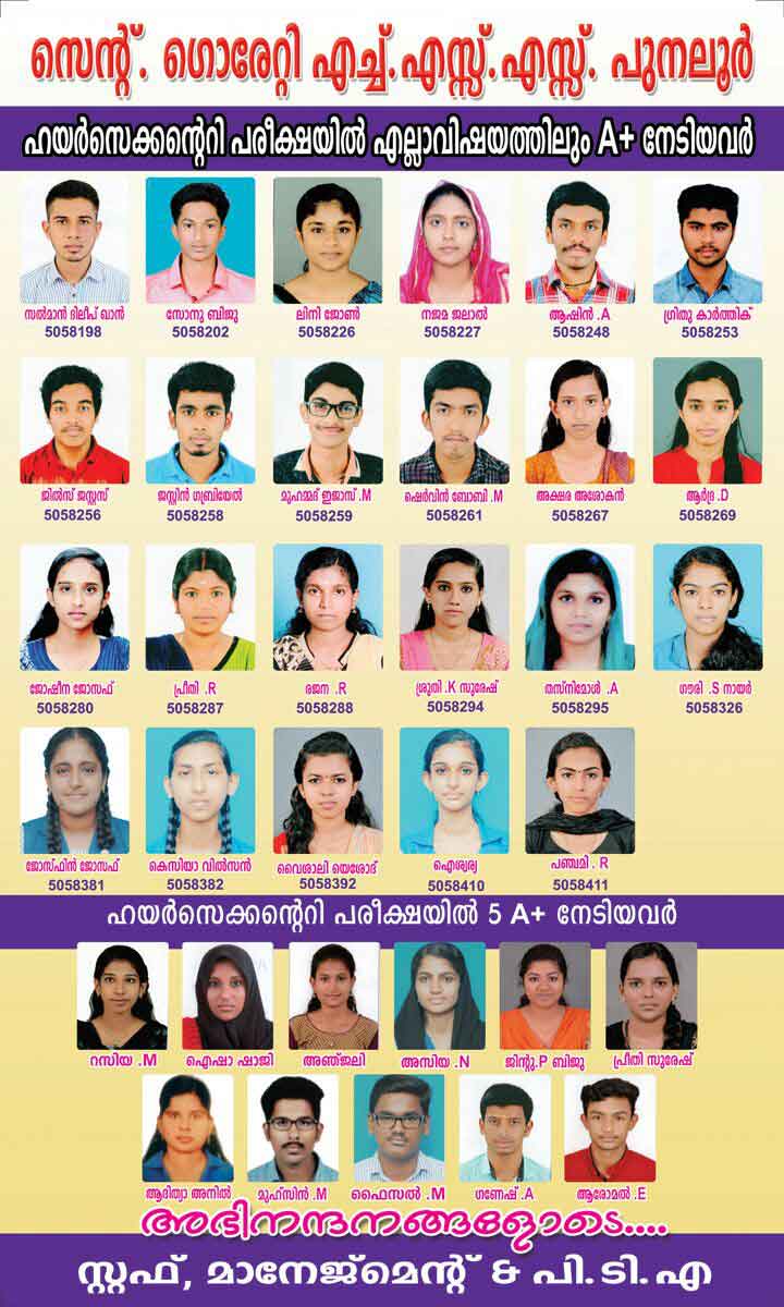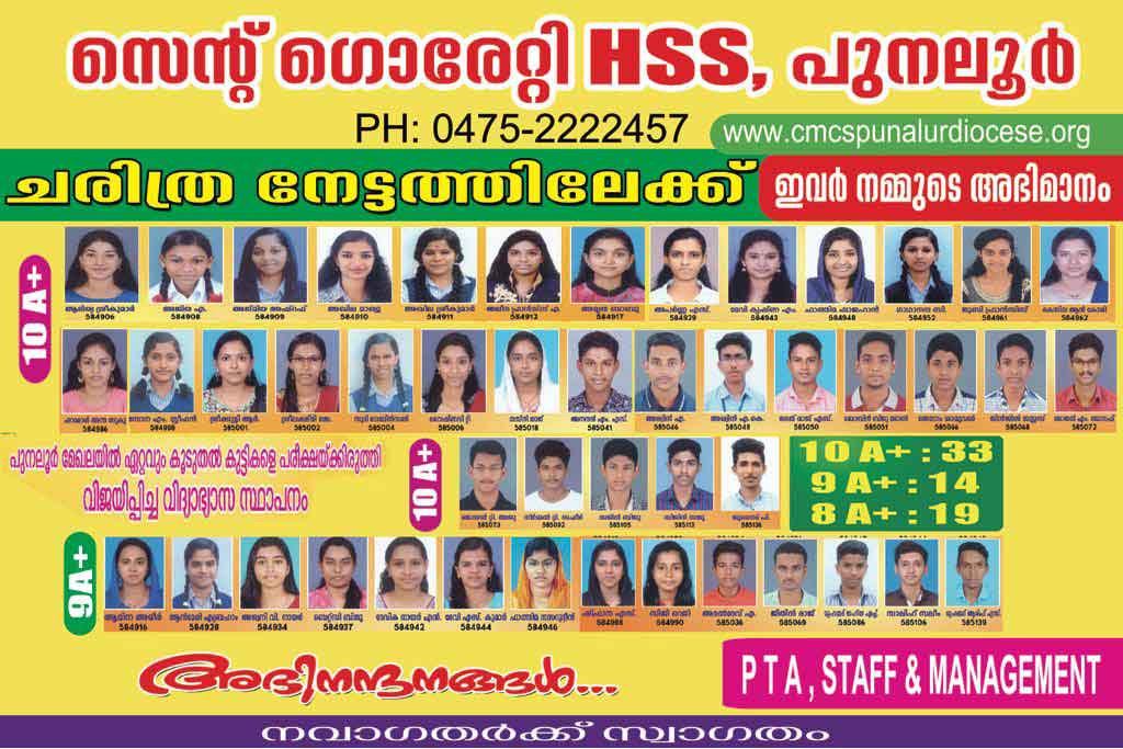 *ചരിത്രനേട്ടങ്ങളുടെ സുവർണ്ണ കിരീടത്തിലേക്ക് വീണ്ടുമൊരു പൊൻതൂവൽ കൂടി കൂട്ടിച്ചേർത്ത് 2020 മാർച്ച് SSLC പരീക്ഷയിലും പുനലൂർ സെന്റ് ഗൊരേറ്റിയുടെ വിജയാശ്വമേധം.* *2020 മാർച്ച് SSLC പരീക്ഷയിൽ 42 ഫുൾ എ പ്ലസ്സുകളും, 20 ഒൻപത് എ പ്ലസ്സുകളും കരസ്ഥമാക്കി സമ്പൂർണ്ണവിജയം എന്ന സുവർണ്ണ നേട്ടവുമായി കിഴക്കൻ മേഖലയുടെ അഭിമാനമായി പുനലൂർ സെന്റ് ഗൊരേറ്റി. 322 ഓളം കുട്ടികളെ പരീക്ഷയ്ക്കിരുത്തി പുനലൂർ മേഖലയിൽ ഏറ്റവും കൂടുതൽ കുട്ടികളെ പരീക്ഷയ്ക്കിരുത്തി വിസ്മയവിജയം സ്വന്തമാക്കിക്കൊടുത്തു കൊണ്ട്, ചരിത്രം തിരുത്തിക്കുറിച്ച് സെന്റ് ഗൊരേറ്റിയുടെ വിജയഗാഥ തുടരുകയാണ് .*