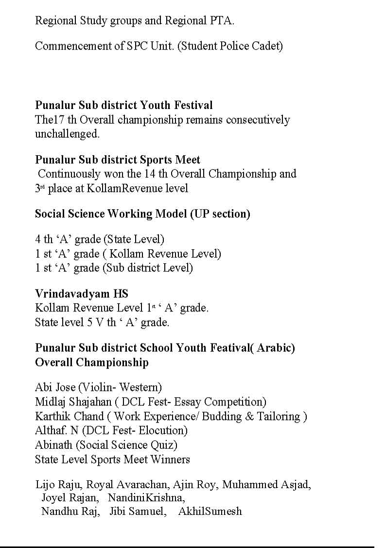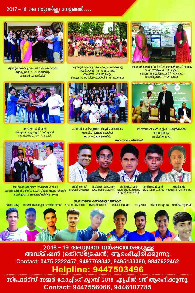 കഴിഞ്ഞ നിരവധി വർഷങ്ങളായി ഉപജില്ല ജില്ലാ സംസ്ഥാന തലങ്ങളിൽ മികച്ച വിജയങ്ങൾ കരസ്ഥമാക്കുന്ന നിരവധി കലാ പ്രതിഭകളെ പുനലൂരിന്റെ കലാ-സംസ്കാരിക മേഖലക