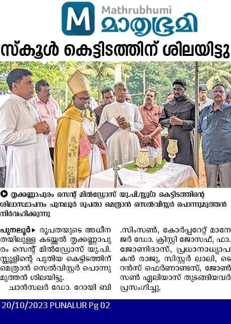 കടയ്ക്കൽ : നൂറിലധികം വർഷങ്ങളായി കടയ്ക്കലിന്റെ വിദ്യാഭ്യാസ മേഖലയിൽ നിസ്തുലമായ സംഭാവനകൾ നൽകിയ തൃക്കണ്ണാപുരം സെന്റ് മിൽഡ്രഡ്സ് യു.പി.എസി.ന്റെ അത്യാധുനിക സൗകര്യങ്ങളോടുകൂടിയ പുതിയ കെട്ടിട സമുച്ചയത്തിന്റെ ഉദ്ഘാടനം 2024 ഡിസംബർ 27 വെള്ളി വൈകുന്നേരം അഞ്ചുമണിക്ക് പുനലൂർ രൂപത വികാർ ജനറൽ റവറന്റ് മോൺസിഞ്ഞോർ സെബാസ്റ്റ്യൻ വാസ് നിർവഹിച്ചു. നൂറു വർഷത്തിലധികമായി കടക്കലിന്റെ കലാ,സാംസ്കാരിക, രാഷ്ട്രീയ മേഖലകളിൽ നിരവധി പ്രതിഭകളെ സംഭാവന നൽകിയ തൃക്കണ്ണാപുരം സെന്റ് മിൽഡ്രഡ്സ് യു. പി. എസ്. ലെ വിദ്യാർത്ഥികളുടെയും രക്ഷിതാക്കളുടെയും നാടിന്റെയും വർഷങ്ങളായുള്ള സ്വപ്നമായ പുതിയ കെട്ടിട സമുച്ചയം ഉദ്ഘാടനം ചെയ്ത് നാടിനു സമർപ്പിച്ചപ്പോൾ നാട് അത് ഉത്സവാഘോഷത്തിൽ ഏറ്റെടുത്തു. വിദ്യാർത്ഥികൾ, രക്ഷിതാക്കൾ, പൂർവ്വവിദ്യാർത്ഥികൾ, മുൻ പി റ്റി എ ഭാരവാഹികൾ, മുൻ പ്രഥമധ്യാപകർ, അധ്യാപകർ, പൊതുജനങ്ങൾ അങ്ങനെ നാടുമുഴുവൻ വിദ്യാലയത്തിലേക്ക് ഒഴുകിയെത്തി ഈ ചരിത്ര നിമിഷത്തിന് സാക്ഷ്യം വഹിക്കുവാൻ. പുനലൂർ രൂപത കോർപ്പറേറ്റ് മാനേജർ റവ. ഡോ. ക്രിസ്റ്റി ജോസഫ് അധ്യക്ഷത വഹിച്ച ചടങ്ങിൽ കുമ്മിൾ ഗ്രാമപഞ്ചായത്ത് വൈസ് പ്രസിഡണ്ട് ശ്രീമതി രജിതകുമാരി ചടയമംഗലം ബ്ലോക്ക് പഞ്ചായത്ത് മെമ്പർ ശ്രീ സുധിന് കടയ്ക്കൽ, ആനപ്പാറ വാർഡ് മെമ്പർ ശ്രീമതി വത്സ, തൃക്കണ്ണാപുരം നിത്യസഹായ മാതാ ദേവാലയ സെക്രട്ടറി ശ്രീ സിറിൾ യേശുദാസ്, സെന്റ് ചാൾസ് കോൺവെന്റ് സുപ്പീരിയർ സിസ്റ്റർ ലിസി ജെയിംസ്, നിത്യസഹായ മാതാ ദേവാലയ വിദ്യാഭ്യാസ ശുശ്രൂഷ കോർഡിനേറ്ററും മുൻ പ്രഥമാധ്യാപകനുമായ ശ്രീ ഫ്രാൻസിസ് എസ്, തുടങ്ങി സാമൂഹിക , സാംസ്കാരിക, രാഷ്ട്രീയ രംഗത്തെ പ്രമുഖർ ആശംസകൾ അറിയിച്ച് സംസാരിച്ചു. ഉദ്ഘാടന സമ്മേളനത്തിന് ശേഷം കുട്ടികളുടെ വർണ്ണാഭമായ കലാപരിപാടികൾ, സമ്മാന പദ്ധതി നറുക്കെടുപ്പ് എന്നിവയും നടത്തപ്പെട്ടു. പിടിഎ പ്രസിഡണ്ട് ശ്രീ ലിതിൻ വെന്നിയോട്, എം പി ടി എ പ്രസിഡന്റ് ശ്രീമതി ജാസ്ന, ശ്രീ സുമിത് സാമുവൽ, ശ്രീ സോണി ലോറൻസ്, അധ്യാപകർ, പിടിഎ, എംപി ടി എ അംഗങ്ങൾ എന്നിവർ പരിപാടികൾ