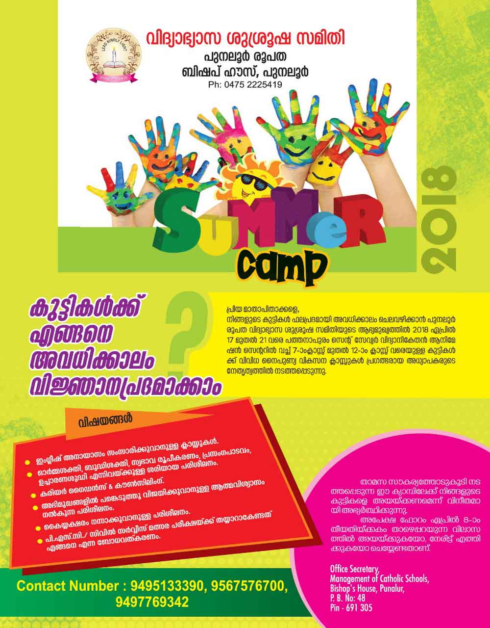 പുനലൂർ രൂപതയിലെ നാലാം ക്ലാസ്സിൽ പഠിക്കുന്ന കുട്ടികളുടെ സംഗമം നടത്തി*. പുനലൂർ രൂപതയിലെ നാലാം ക്ലാസ്സിൽ പഠിക്കുന്ന കുട്ടികളുടെ സംഗമം പുനലൂർ ബിഷപ്പ് ഹൗസിൽ വെച്ച് ബിഷപ്പ് സെൽവിസ്റ്റർ പൊന്നുമുത്തൻ പിതാവിന്റെ സാന്നിധ്യത്തിൽ നടന്നു. രൂപതയിലെ കൊല്ലം, ആലപ്പുഴ, പത്തനംതിട്ട ജില്ലകളിൽ വ്യാപിച്ചുകിടക്കുന്ന വിവധ ഇടവകകളിൽ നിന്നും 200-ൽ പരം കുട്ടികളും സന്ന്യസ്തരും അധ്യാപകരും പങ്കെടുത്തു. സംഗമത്തിൽ അഭിവന്ദ്യ സെൽവിസ്റ്റർ പൊന്നുമുത്തൻ പിതാവും മോൺ. സെബാസ്റ്റ്യൻ വാസ്, ഫാ. റോയ് ബി സിംസൺ,ഫാ. ജസ്റ്റിൻ സഖറിയ,ഫാ. ലിബിൻ, ഫാ. ബിബിൻ, ഫാ. രാജു പൗലോസ്,സി. പമീല, ശ്രീ.സജീവ് ബി വയലിൽ എന്നിവർ കുട്ടികളുമായി സംവദിച്ചു. വിവിധ ഇടവകകളിൽ നിന്ന് കുട്ടികൾ അവരുടെ കലാപരിപാടികൾ അവതരിപ്പിച്ചു.രൂപത പി. ആർ. ഓയും, ശുഭദർശൻ ഡയറക്ടറുമായ വെരി. റെവ. ഡോ. ക്രിസ്റ്റി ജോസഫ് സംഗമത്തിന് നേതൃത്വം നൽകി.