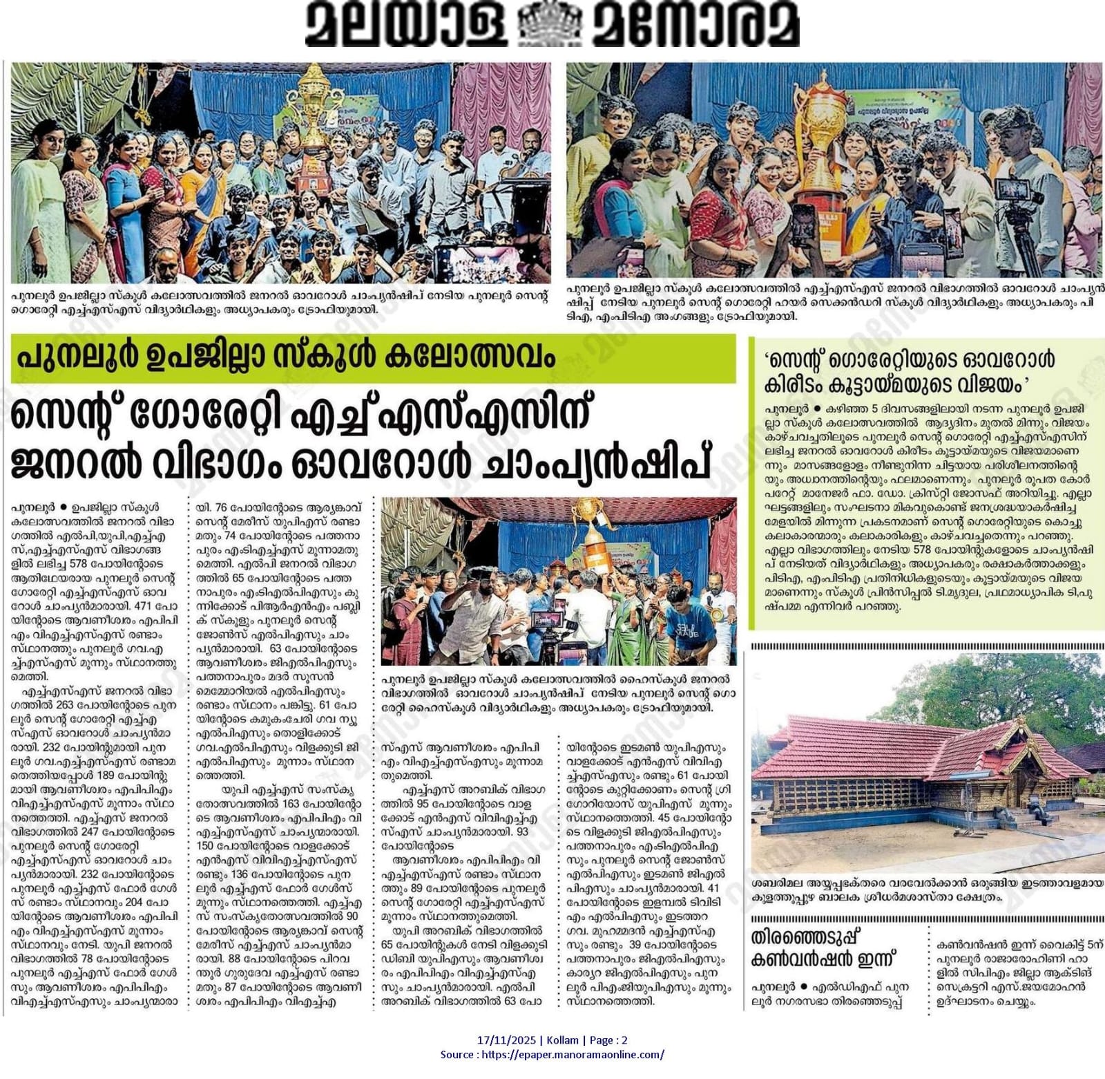 *കൊല്ലം ജില്ലാ കായിക മേളയിൽ സെന്റ് ഗൊരേറ്റി ഹയർ സെക്കൻഡറിസ്കൂൾ അഭിമാനർഹമായ നേട്ടം കരസ്ഥമാക്കി*.*കൊല്ലംജില്ല സ്പോർട്സ് മീറ്റിൽ 18സ്വർണം,4 വെള്ളി,3 വെങ്കലം ഉൾപ്പെടെ 105 പോയിന്റോടെ ജില്ലയിലെ ഒവറോൾ ചാമ്പ്യൻഷിപ്പ് ട്രോഫി സെന്റ് ഗൊരേറ്റി ഹയർസെക്കൻഡറി സ്കൂൾ സ്വന്തമാക്കി*. *പങ്കെടുത്ത എല്ലാ സ്പോർസ് തരങ്ങൾക്കും,വ്യക്തികത ചാമ്പ്യന്മാരായ ജോജി അന്ന,അതിര.എസ്. നായർ,ദിവ്യ ജോസ് എന്നിവർക്കും പ്രത്യേക അഭിനന്ദനങ്ങൾ*. *സ്കൂളിലെ കായികാദ്ധ്യാപകർ ജയചന്ദ്രൻ സർ,ബിനടീച്ചർ,ഏബ്രഹാം സർ,മറ്റ് അദ്ധ്യാപകർ ,പ്രിൻസിപ്പൽ മൃദ്ദുല ടീച്ചർ പ്രഥമാധ്യാപിക പുഷ്പമ്മടീച്ചർ,എന്നിവർക്ക്* *പുനലൂർ രൂപതാദ്ധ്യാക്ഷൻ സെൽവിസ്റ്റർ പൊന്നുമുത്തൻ പിതാവിന്റെയും,കോർപ്പറേറ്റ് മാനേജർ റവ.ഡോ.ക്രിസ്റ്റി ജോസഫ് അച്ചന്റെയും,സ്കൂൾ പി.ടി.എ യുടെയും അഭിനന്ദനങ്ങൾ അറിയിക്കുന്നു*..